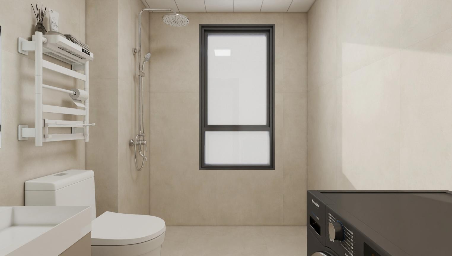 深色系也可以做的很暖,窗户和洗衣机的线条与卫生间的暖色交织在一起。