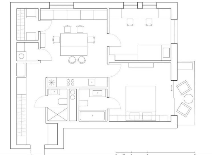 开放的厨房占据公寓中心位置 两间卧室位于 右侧,主卧套房还带有独立卫浴 和小阳台,客厅当中 另设公共卫生间、储藏室