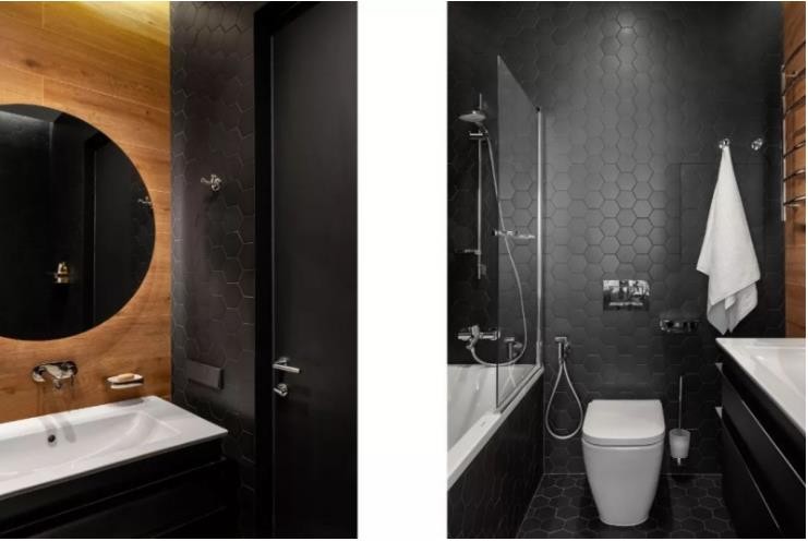卫生间选用黑色哑光 六角瓷砖,与木纹的肌理形成碰撞