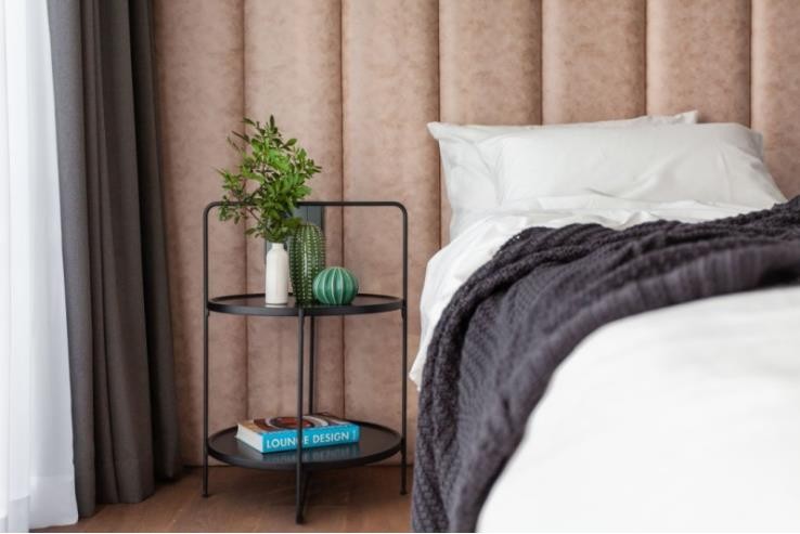 卧室选用较为 温柔的暖色系,软包饰面拼成竖条 带有一种明快的肌理感