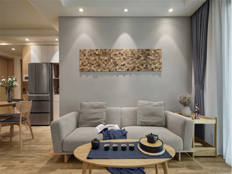墙面挂的就是大小不一的老木头拼画。空间的质感层次也就丰富了起来,和“扁平、单一”的背景墙say goodbye。
