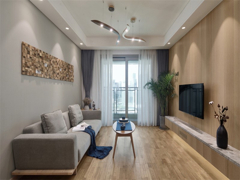 电视柜我们采用悬空的设计,底部藏有灯柱,烘托夜间客厅氛围,主要还是考虑到便于清洁卫生,台面用的古堡灰大理石,耐用易于打理