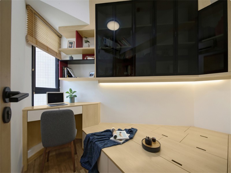 能把书房这超异型的空间折腾出个模样, 简直是对设计师的大考验! 难度系数:★★★★★ 榻榻米和写字台结合起来