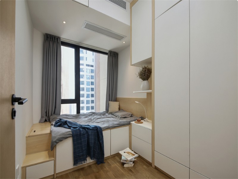 父母房床的位置原来为飘窗,把床的高度设计跟飘窗齐平,同时还多了一排收纳抽屉,天花吊顶把飘窗包裹起来,使空间显得方正