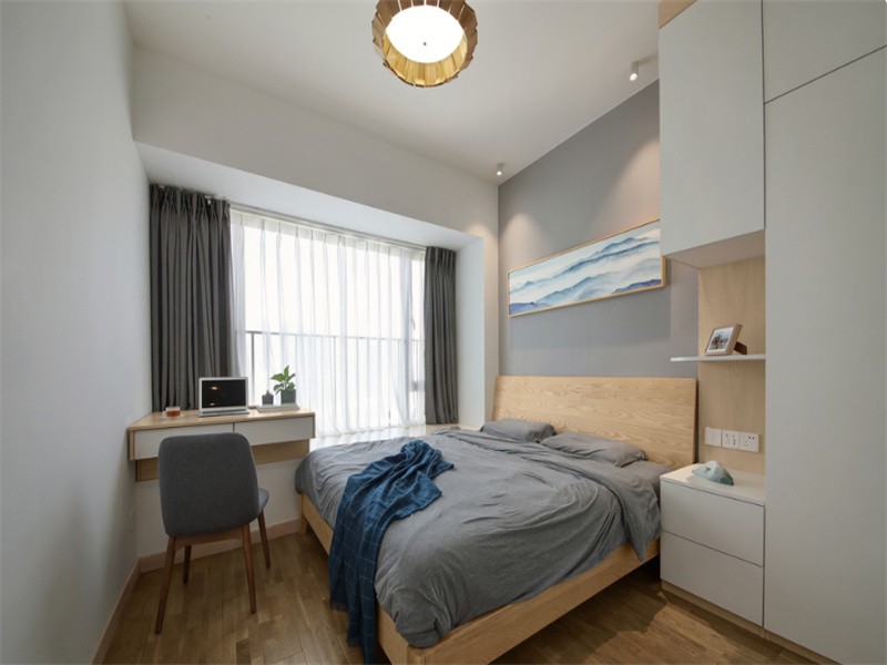 主卧室的背景也是用浅灰***术涂料, 飘窗设计了一个简易梳妆台, 也可当做工作或夜读的小空间。
