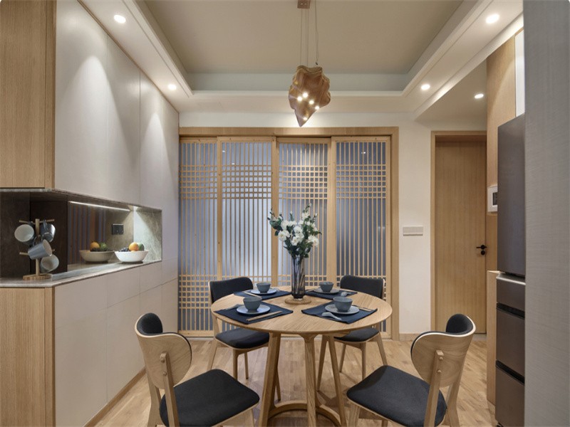 餐厅正面设计满墙的餐边柜,柜门用白色,让空间更加的明亮。中间的镂空设计,可以放小电器和其他物品