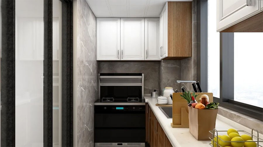 中式厨房必须是封闭式的,煎炸烹饪油烟大,推拉门这样半透明的设计,有种朦胧美。