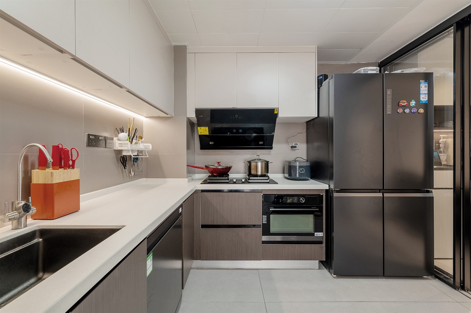 厨房做了经典的L型布局,将空间***化利用起来,也保证了厨房的动线合理,实用性更强。跟生活阳台之间没有做隔断,看上去更显开阔大气。 靠门边特意预留出足够的空间摆放冰箱,合理规划布局。在墙面上方都做满了吊柜,大大增强了储物能力。 柜子做的还是无把手的设计,更符合整屋极简的态度。吊柜下方增加了灯带,尤其是晚间或背光时操作,照明更方便。