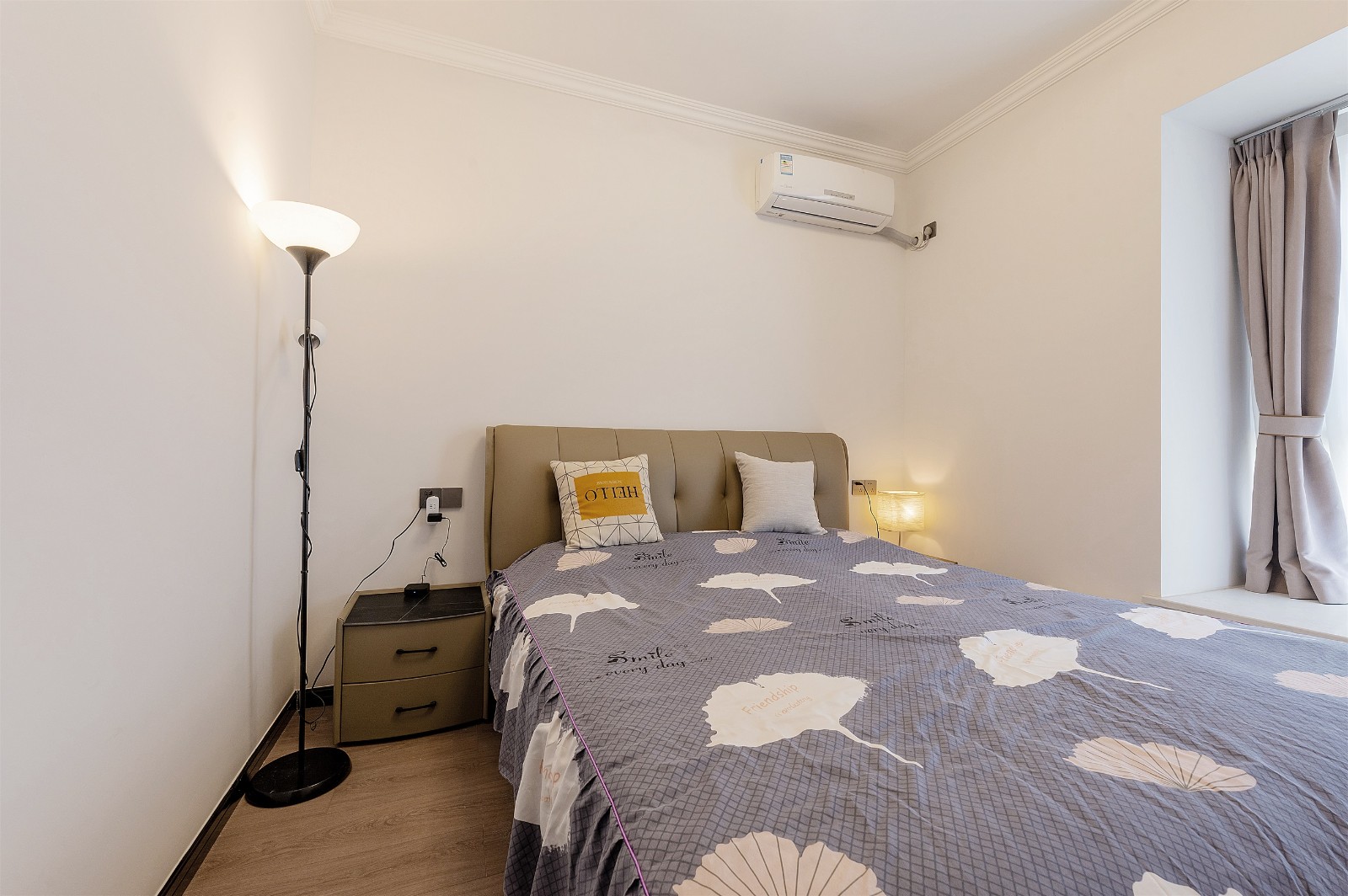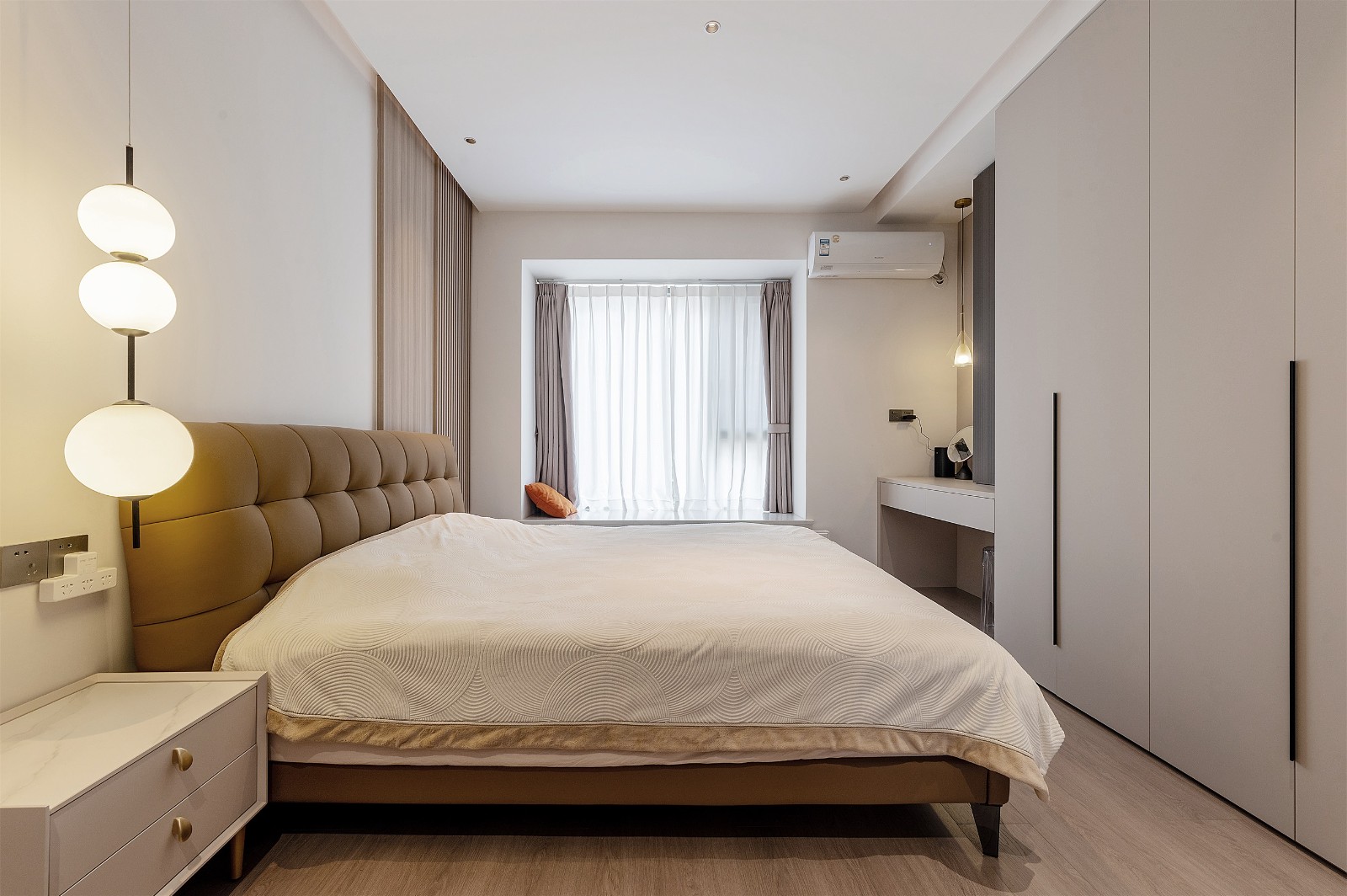 床头背景墙跟公区一样没有做什么过多的设计,只是在侧边加入了少量的木板上墙,增加层次感,不会觉得卧室单调。