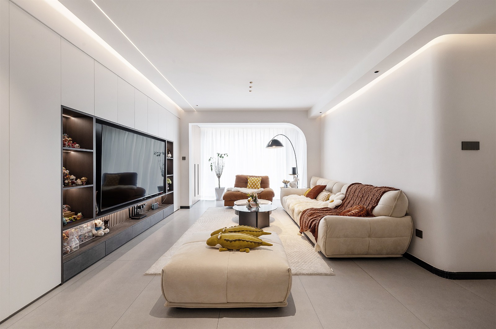 地面选择了浅灰色的地砖通铺,特意选择柔光砖,不会感到空间单一,也不会过于沉闷,反而多了些温和的气息。 电视背景墙做了整面的储物柜,中间将电视机嵌入,既增加了充足的收纳,也保证了整体的和谐美观性。