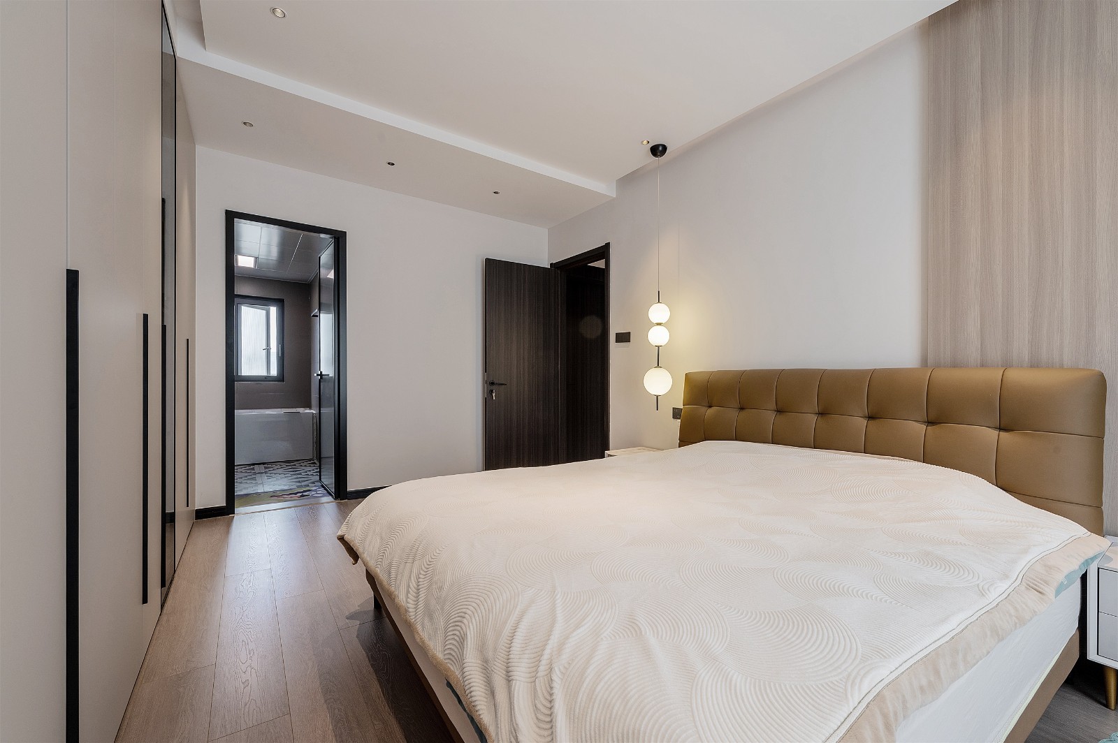 主卧的面积宽敞,***选择在床尾做了一整面的衣柜,定制的到顶设计,收纳能力超强。侧边特意做了一体式的书桌,满足业主的使用需求。 卧室跟公区不同,这里选择了天然的木地板铺贴,木材独有的温馨治愈气息,更容易营造良好的睡眠环境。
