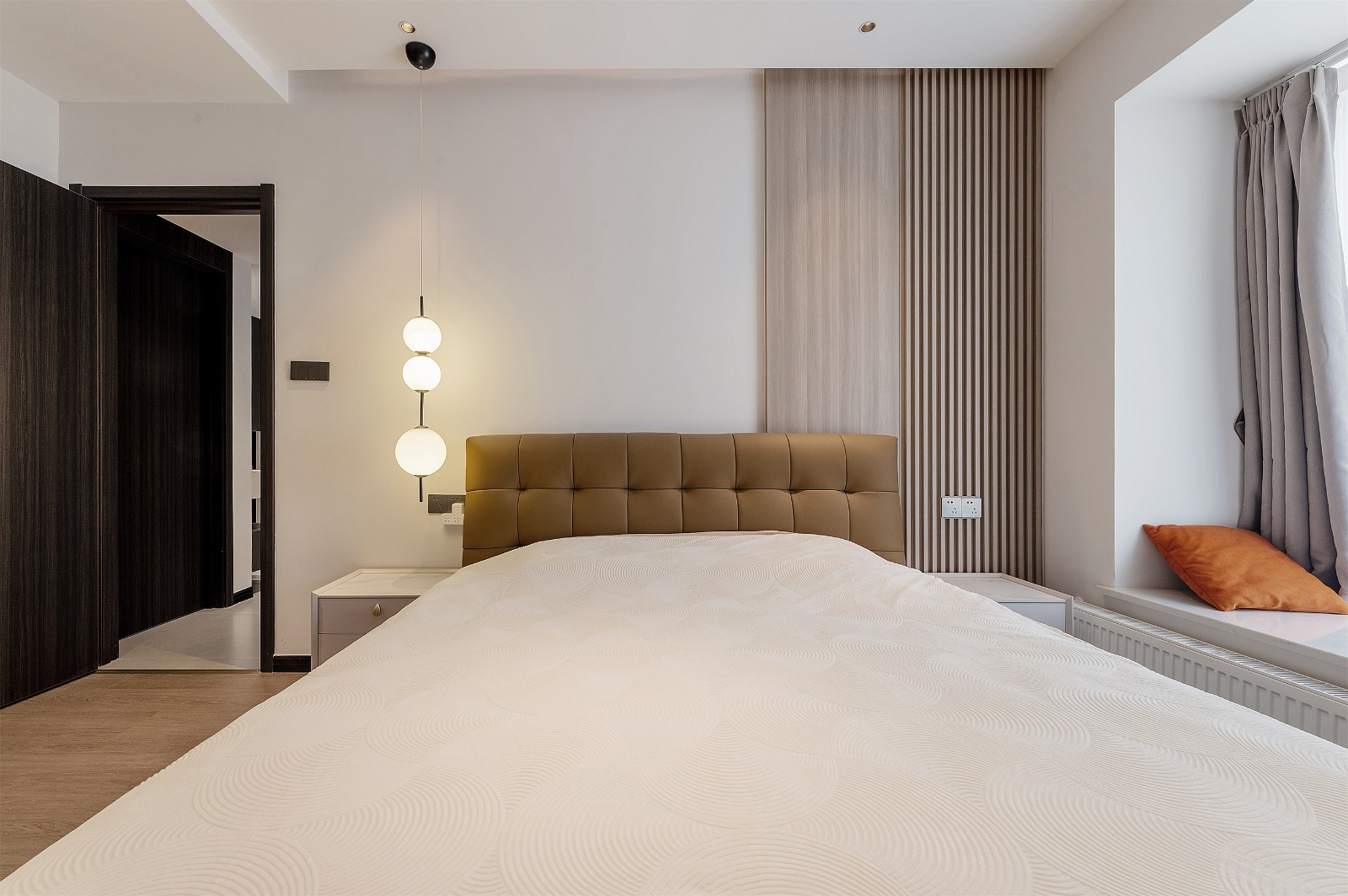 搭配上暖色调的皮质床,不仅柔软舒适,还让卧室看上去更加温馨。在木材的衬托下,让睡眠更加舒适。 床头一侧则是安装了一盏小吊灯,弥补了背景墙的单一,不对称的造型也让空间看上去更加精致奢华。