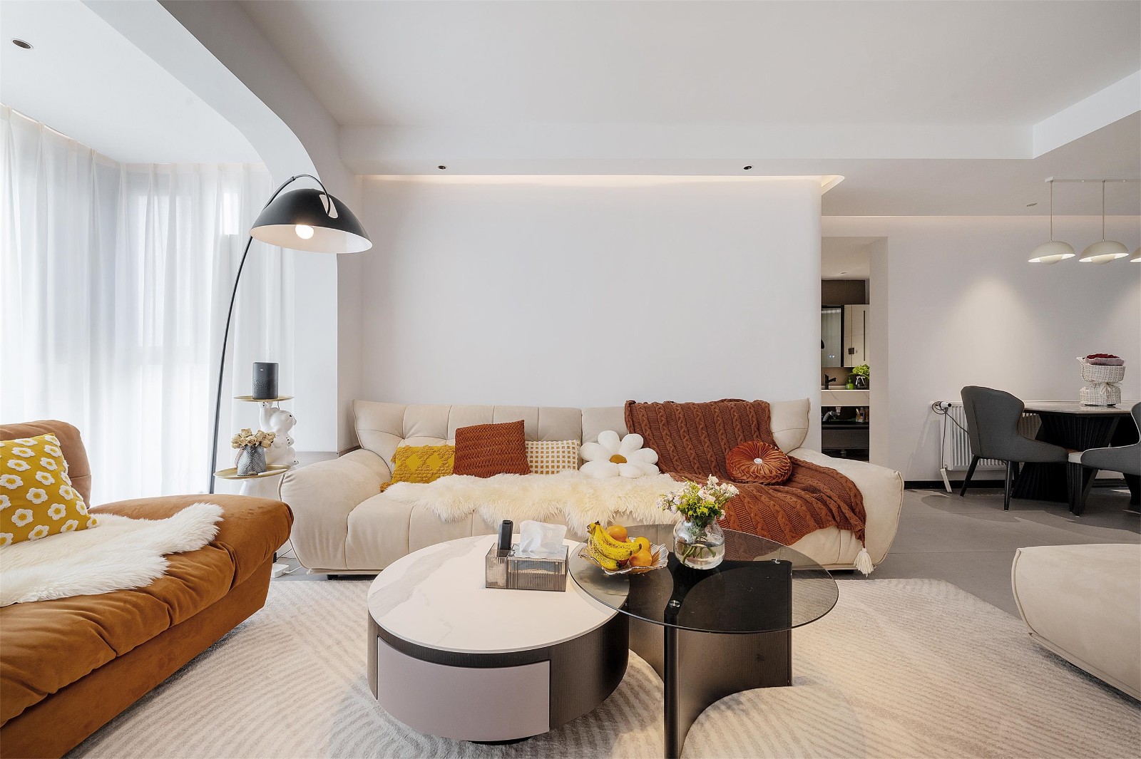 全屋以轻硬装重软装的手法来搭配,利用暖色调的家具提升视觉饱和度,兼顾到颜值和切实的居住体验。 米白色的布艺沙发,和南瓜色的懒人沙发组合,运用青春明亮的色彩提升整屋的明亮度,感受年轻时尚的活力感。 黑白配的圆形茶几,小巧的款式,实用性强。而且经典耐看的款式,跟整体色彩更契合,不易产生视觉疲劳。