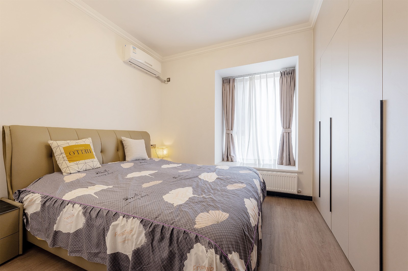 次卧的面积稍微小一点,所以就没在背景墙上做复杂的设计,全面留白,在简约搭配中,却也能感受到***的时尚感。 跟主卧一样在床尾做的衣柜,采用两段式的设计,多功能储物更方便。也是定制的到顶衣柜,储物量超足。