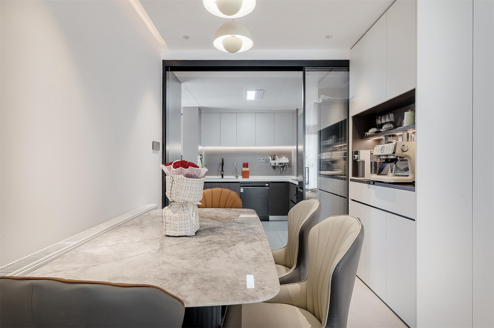 餐厅空间的面积不是特别大,而且在进出厨房的过道上,为了节省空间,就决定将餐桌椅靠墙摆放,留出更多的活动空间。 墙面都是统一的留白处理,没有多余的装饰,给视觉减少不必要的累赘感。靠厨房外的墙面则是做了一组顶天立地的餐边柜,收纳能力一绝。 柜子中间留空,日常储物更方便。还做了部分的开放格,满足多功能储物的需求。加入LED灯带,晚间照明更方便。