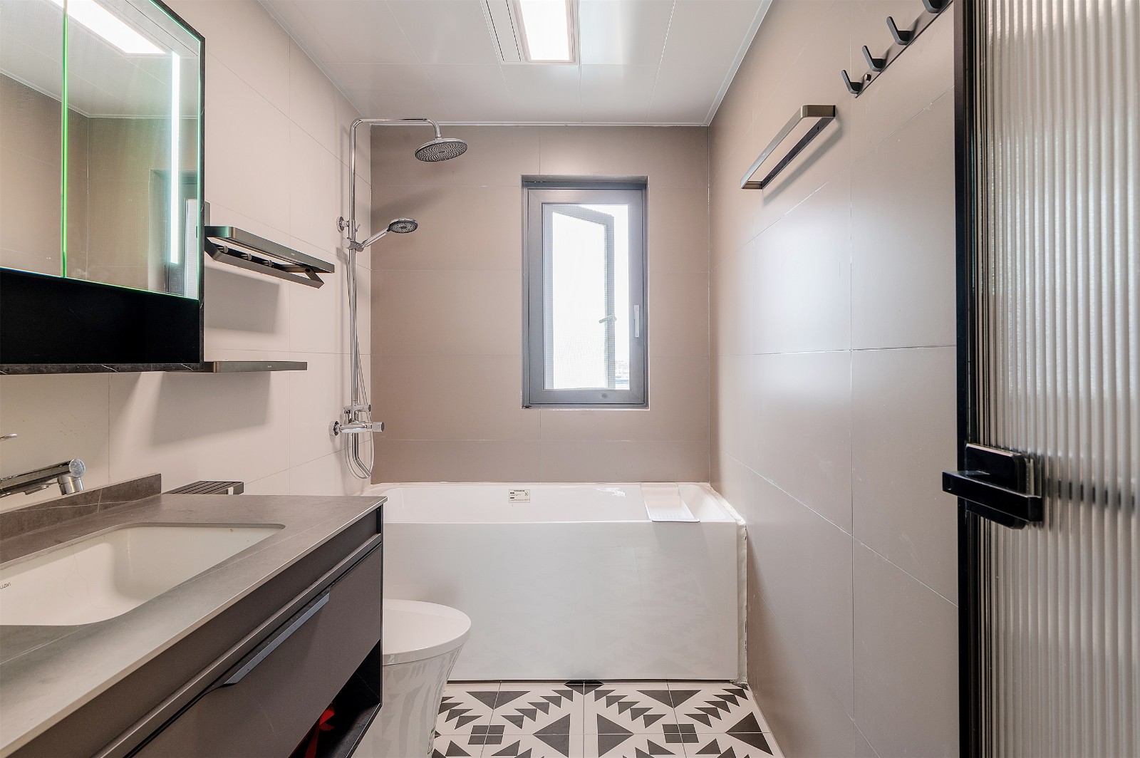 主卫最里侧根据业主夫妇的喜好安装了浴缸,大大提升了格调与品位。没有做干湿分离,节省空间也节约了预算。 大胆选了粉色的瓷砖铺贴,自带暖意的色彩让卫生间也变得更舒适。地面则是经典的黑白配地砖,多样的色彩融合,更能体现时尚***感。 黑色的悬浮洗漱台,让色彩叠加视觉效果更丰富,经典的铝扣板吊顶,百搭耐看,防潮性更好。镜柜也拥有超强的储物能力,一举多得。