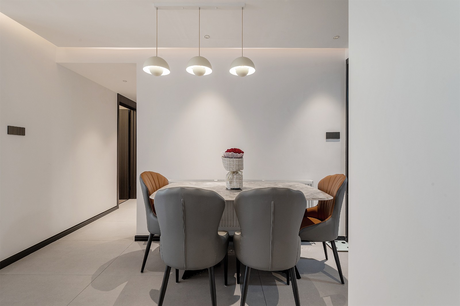 餐桌椅的款式则是很常见百搭的搭配,灰白配的撞色组合,丰富了视觉效果,也不会容易过时,四人桌对于一家人来说也是够用了的。 餐桌上方安装了一盏组合式的吊灯,简约的白色筒灯造型,精致又显***。不只是增加了照明,更是提升了整屋的格调。