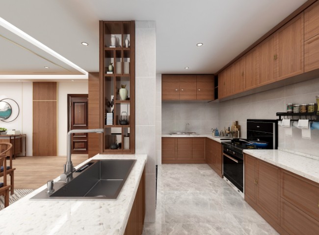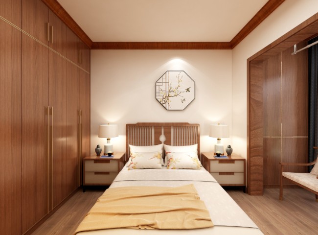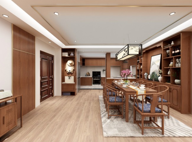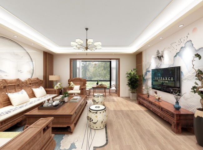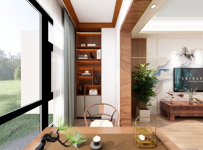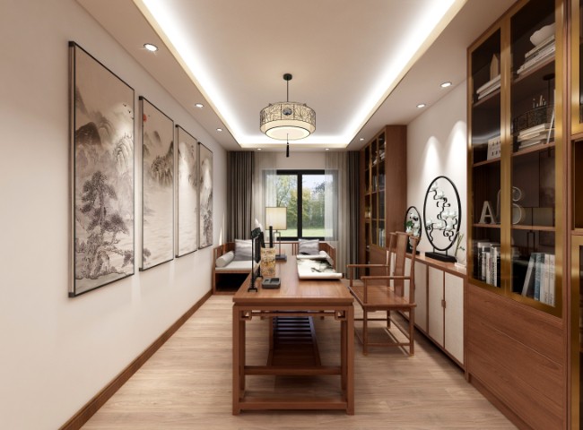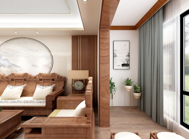 室内中式风格陈设包括字画、匾幅、挂屏、盆景、瓷器、古玩、屏风、博古架等,追求一种修身养性的生活境界