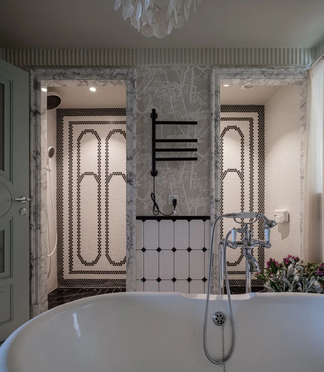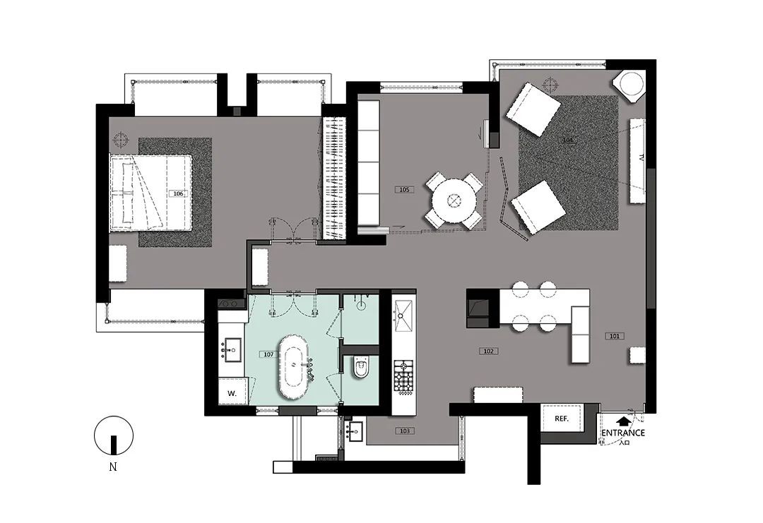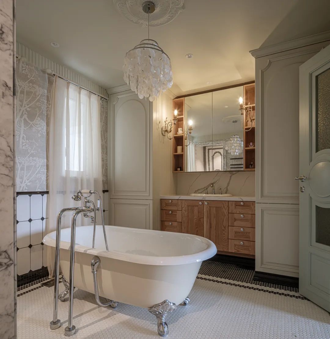 作为“浴缸”刚需大户,原户型的两个小小卫生间拆除隔墙后,“新”卫浴空间,面积升级到11m²,浴缸布局于原两处窄窗中心线,做足仪式感的同时,四周也富余充足的走道空间。