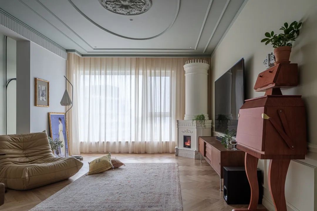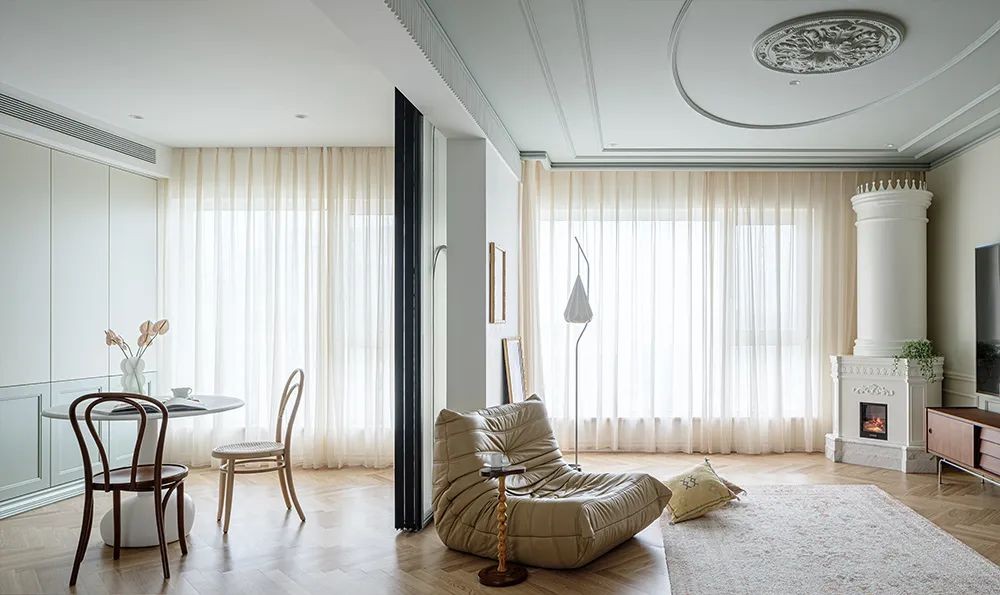 客厅故意而为之的无主灯设计,尽可能的释放了层高。装饰灯盘下,没有臃肿的多人位沙发,仅铺了一张地毯,一方面留足了毛孩自由奔跑的场地,一方面也便于清洁打理。