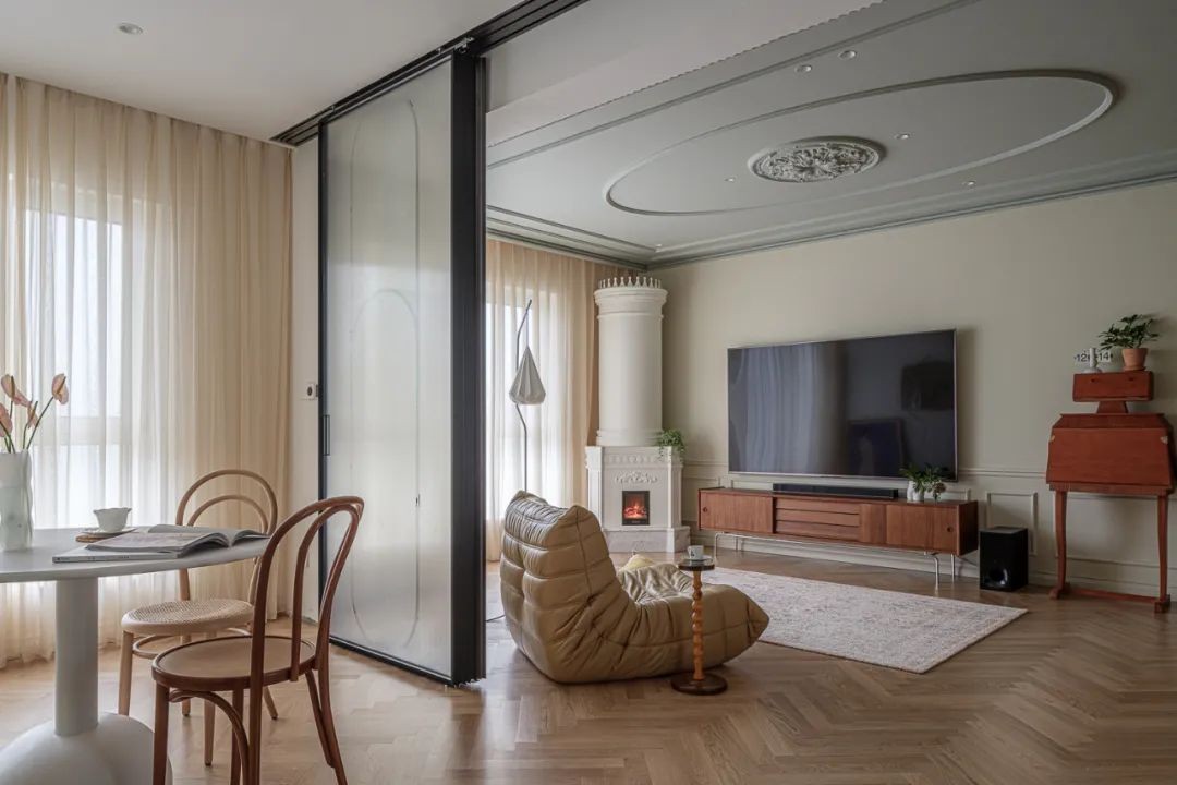 再进入客厅,我们拆除了原先次卧和客厅的半堵隔墙,用三联动移门作为隔断,这样日常打开,餐厅(多功能)与客厅形成了一个通透感十足的大开间!