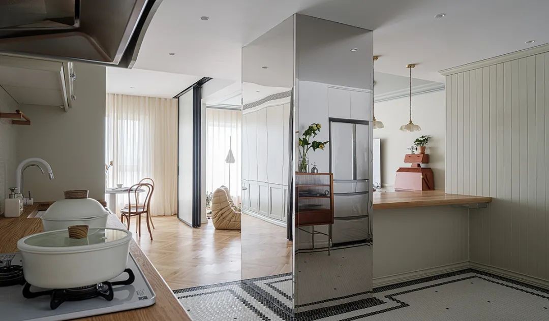 从玄关处看向厨房,一起回家的夫妇,厨房、客厅分流,调酒做饭,日常相伴。