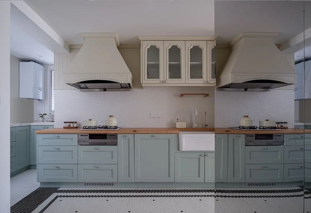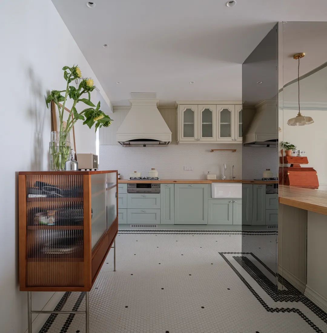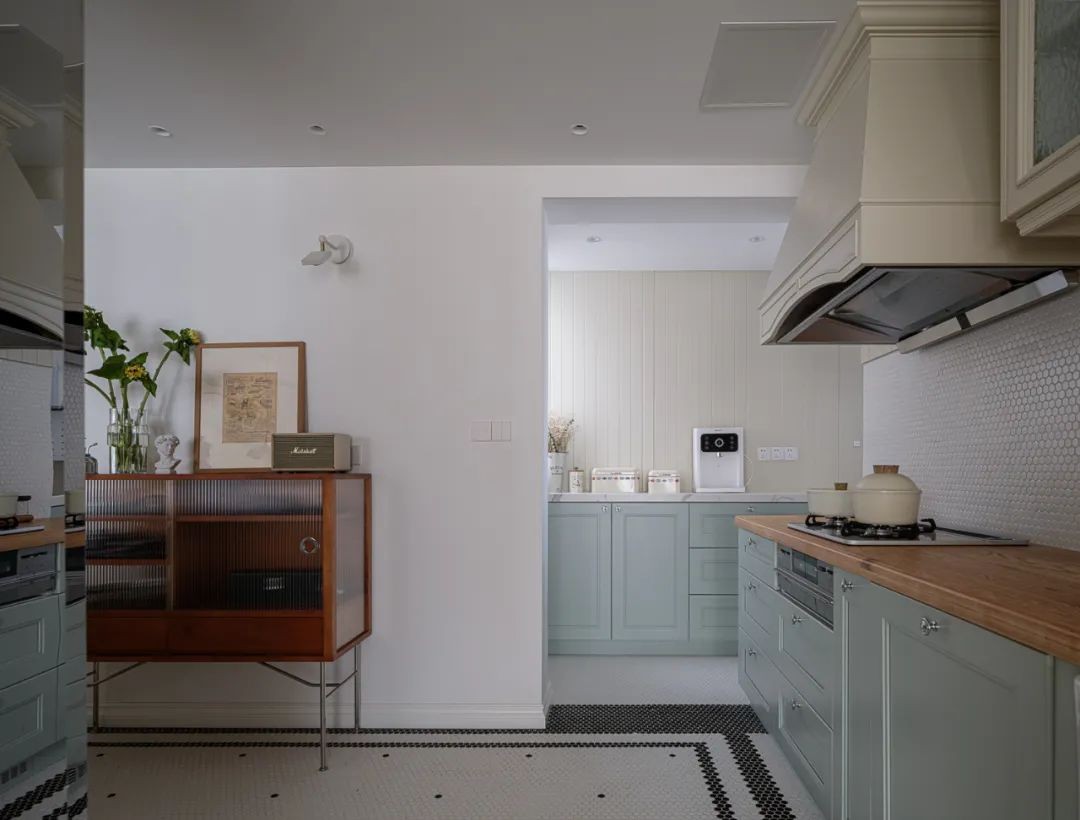将一些略有噪音的设备安置于远离起居的区域,最内里侧同样做了盥洗池,安装了厨余垃圾处理器,美观与功能一个不落下。