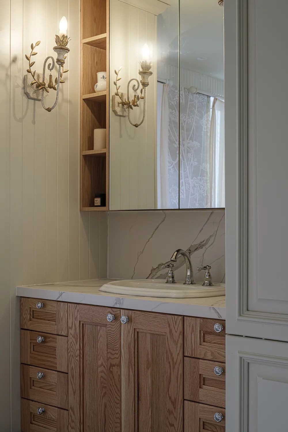镜柜部分即做了开放式收纳也做了隐藏式收纳,兼顾方便与美观,内里处预留了插座,电动牙刷、剃须刀、吹风机都很方便。