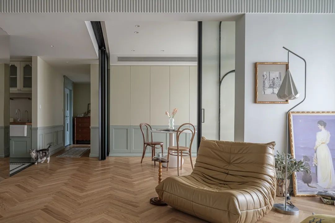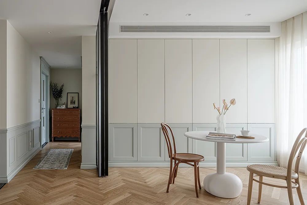 拆除了一间次卧,如果有客人来访,两侧轨道门拉开,空间就被分割成独立的空间,放上气垫床,临时卧室超快诞生。
