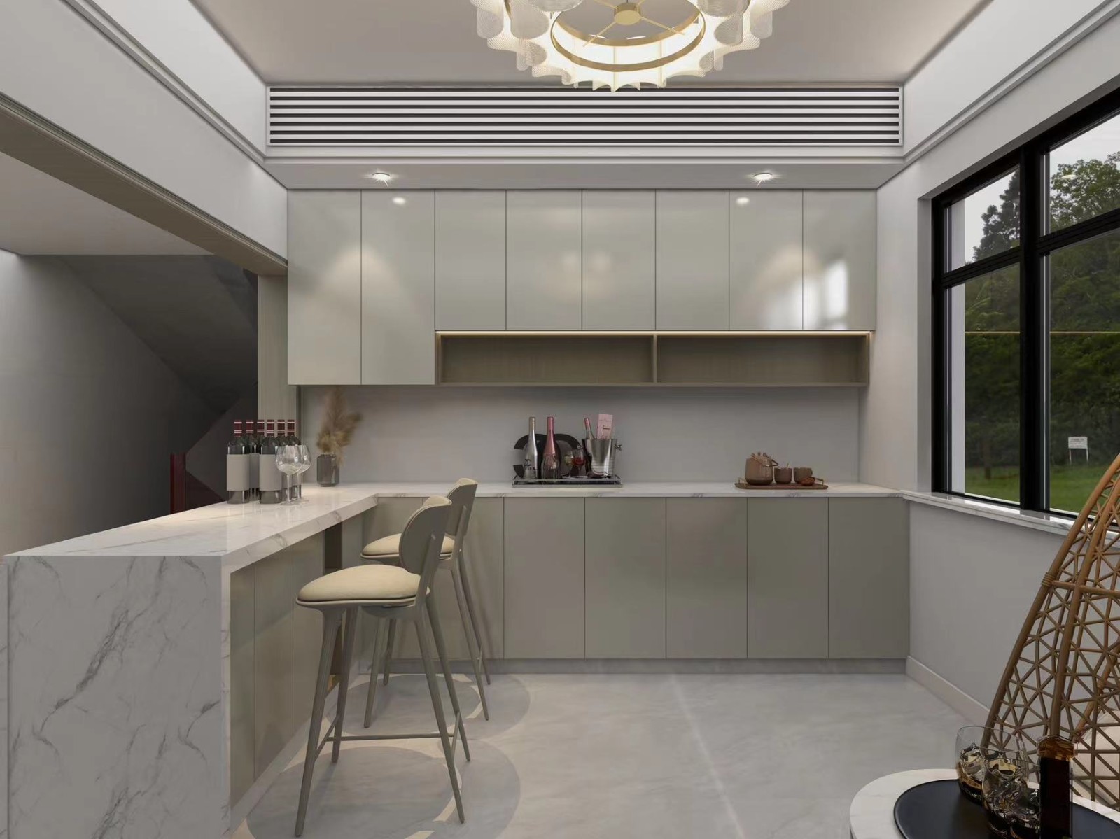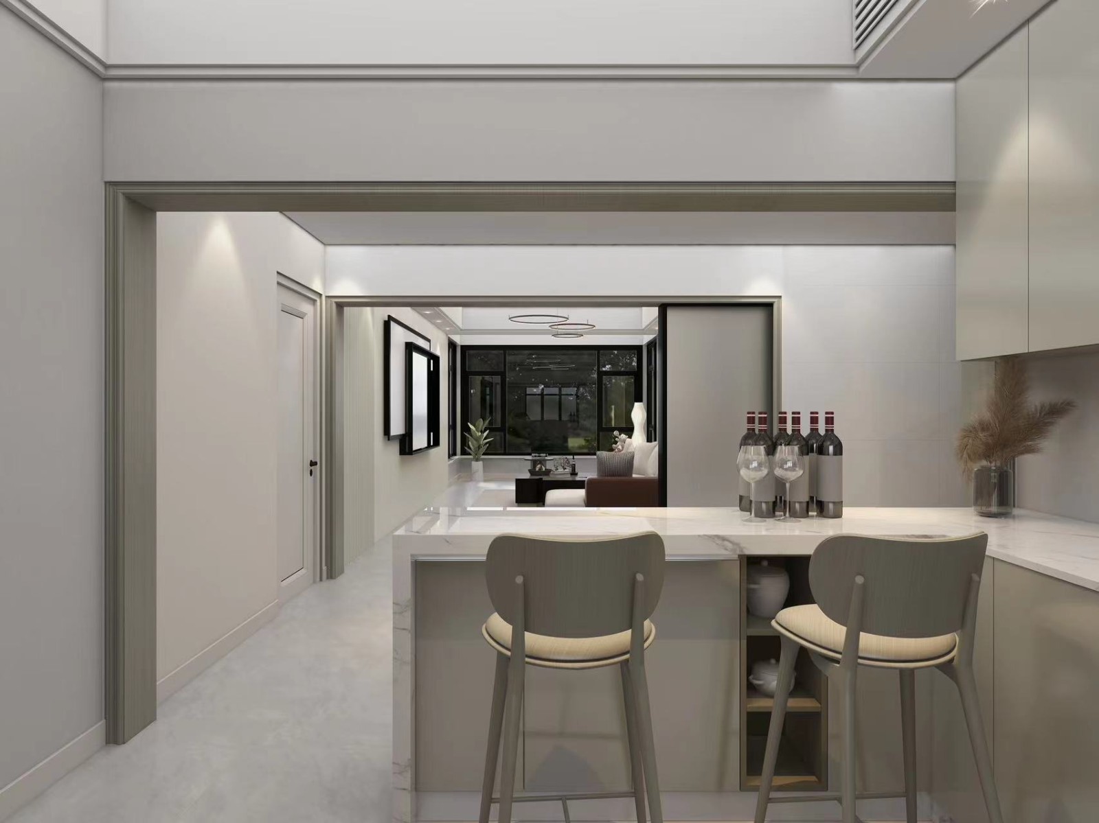 厨房独立的操作台,布局上简约大气。独特的设计更好的区分了简餐和精餐的操作氛围,两者之间相互没有干扰。在一定程度上避免了各类的食材乱罢乱放,其次也提高了收纳空间和效率。整体效果即规整有序也干净整洁。
