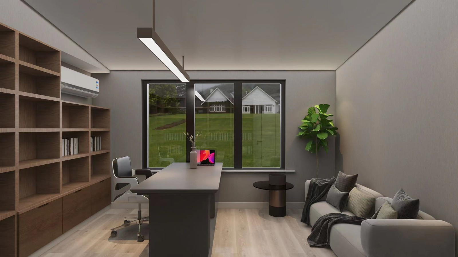 书房在整体设计中显得十分舒适,以木制地板,书架为主搭配静谧灰。给人一种浓厚的书香气息,这个能使人静下心来工作,学习。对面摆放了简约的灰色沙发和绿植,整体上给书房添加了一丝清新自然与年轻活力的氛围。房间没有过多的装饰,一切从功能出发,体现了富有朝气的气息与状态。