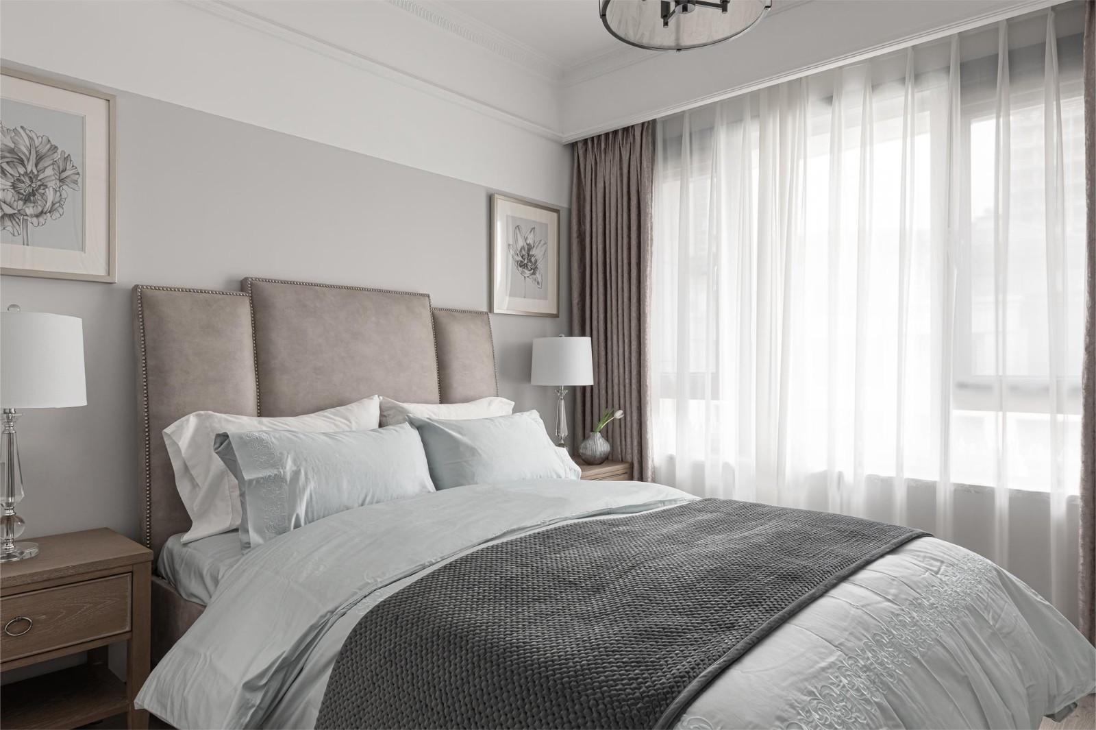 了保持主卧的原始层高,更具空间感,我们将原始异形顶改造为穹顶造型。90°造型落地窗,花园的美景将尽收眼底。优雅的壁画、精致的金属吊灯、典雅的床尾沙发、拼色窗帘,空间的氛围如在度假一般感受