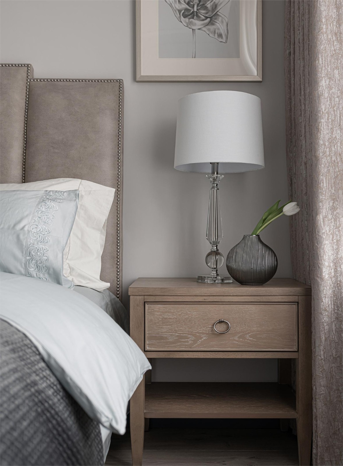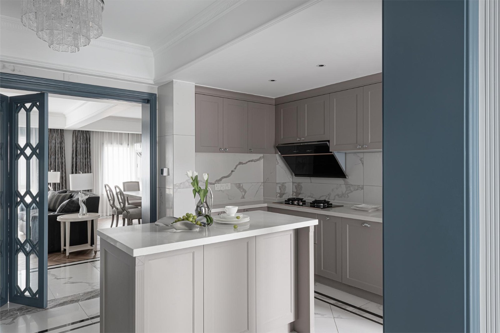 对称感在餐厅的硬装部分得到淋漓尽致的展示,旅行中的战利品通过非对称的方式进行陈列,让空间平添一份活泼、灵动。蓝色绣球与主挂画相得益彰,女屋主对花材的喜爱在这里得以体现,环境所创造的场景与他们的生活习惯密切相连。