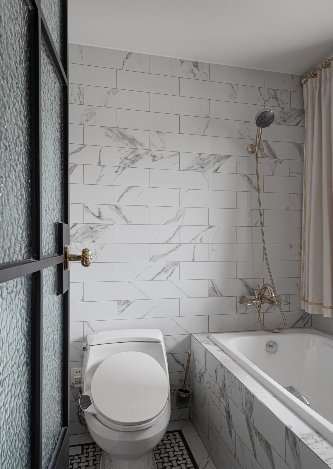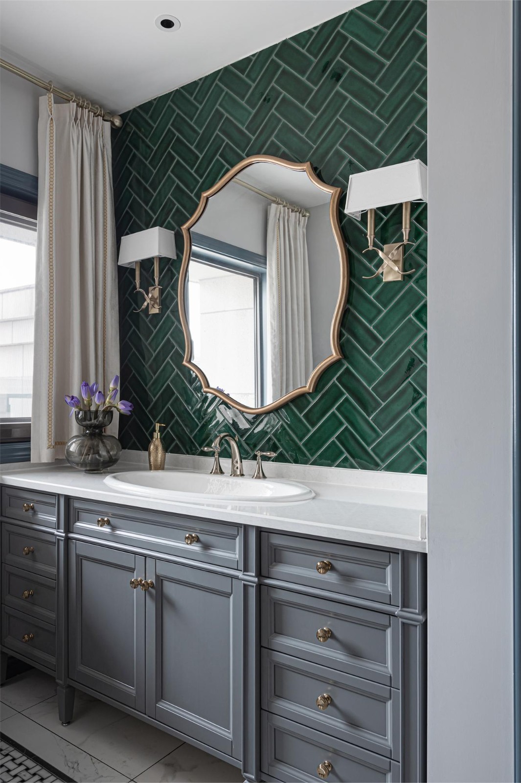 黑白的编织纹地砖是步入卫生间的***份仪式感, 精致巧妙的复古造型面镜与典雅的翡翠绿人字拼瓷砖进行搭配,经典与摩登交融其中,是能够体会、触碰得到的柔情蜜意。