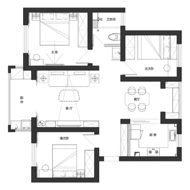 “简约不是没东西,是把生活藏进看不见的细节里”—— 用通顶柜收尽杂物,用低饱和配色统一视觉,用无主灯弱化压迫感,装出 “越住越舒服” 的整洁日常。
