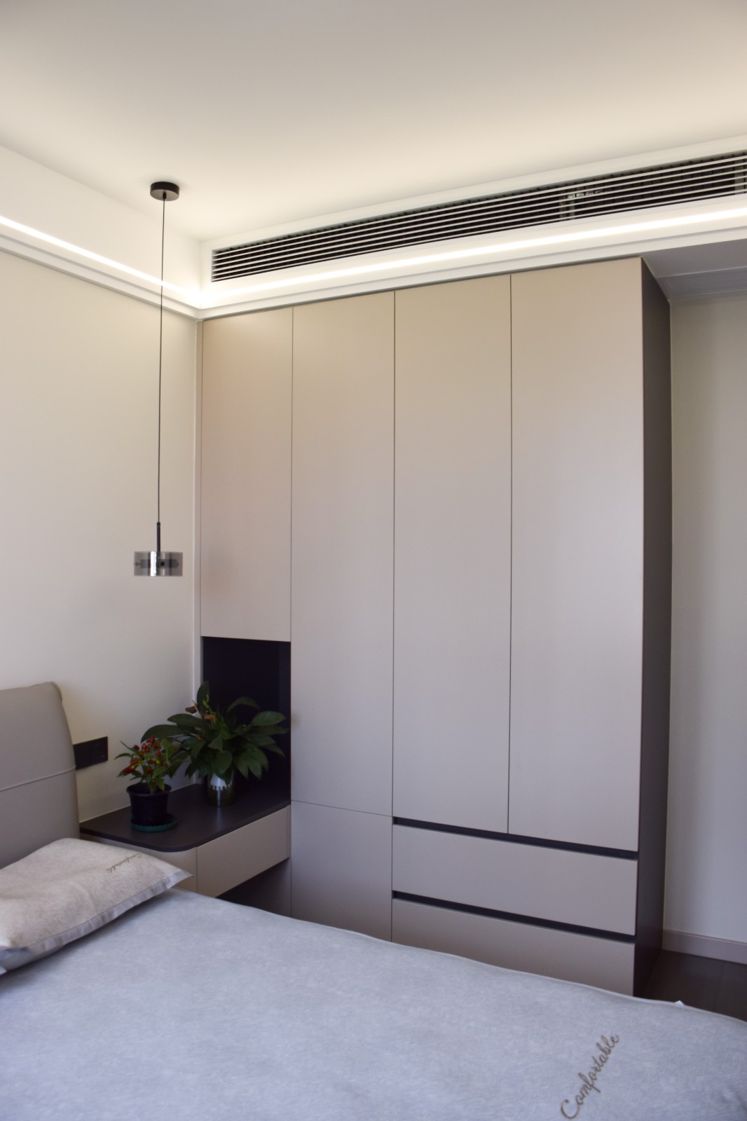 通顶衣柜 + 悬浮床头柜,用线性灯代替主灯,关上门,就是能卸下疲惫的安静角落。