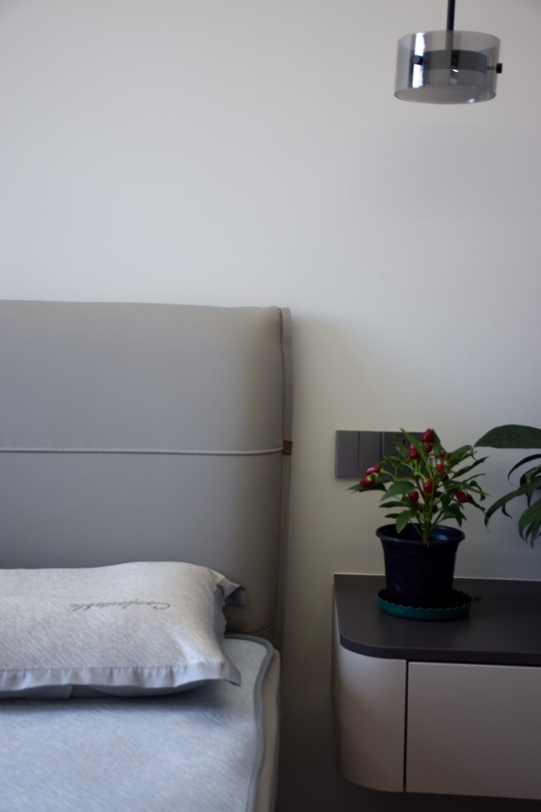 浅灰软包床头 + 简约床品,连小盆栽都选了低饱和色系。