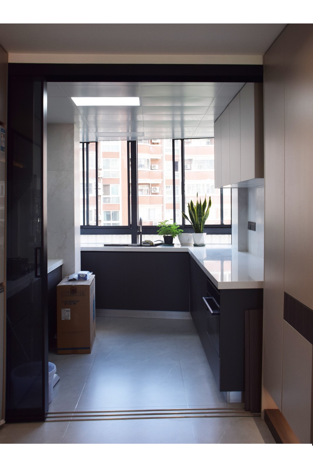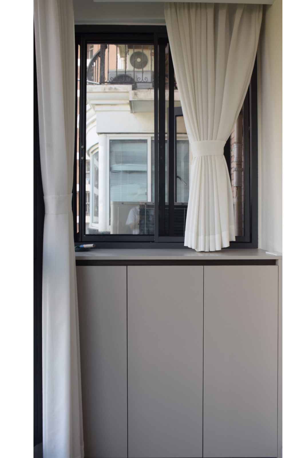 浅灰 + 米白的柜体配色,和墙面无缝衔接 ,小阳台也能既是功能区,又是视觉亮点。