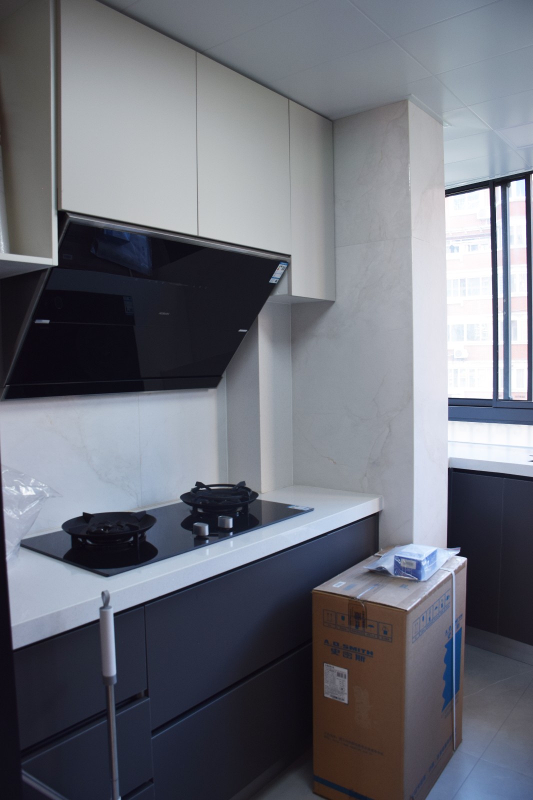 上白下黑的橱柜 + 石英石台面,藏起烟灶与收纳。