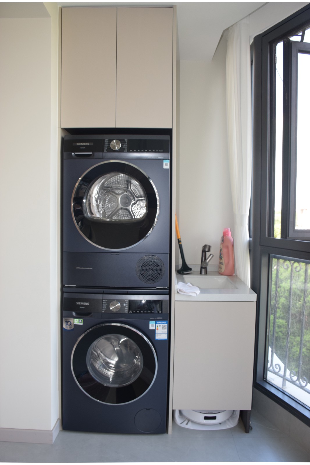 叠放西门子洗烘套装,搭配通顶柜 + 嵌入式洗手台,把洗衣液、清洁工具全收进柜内。