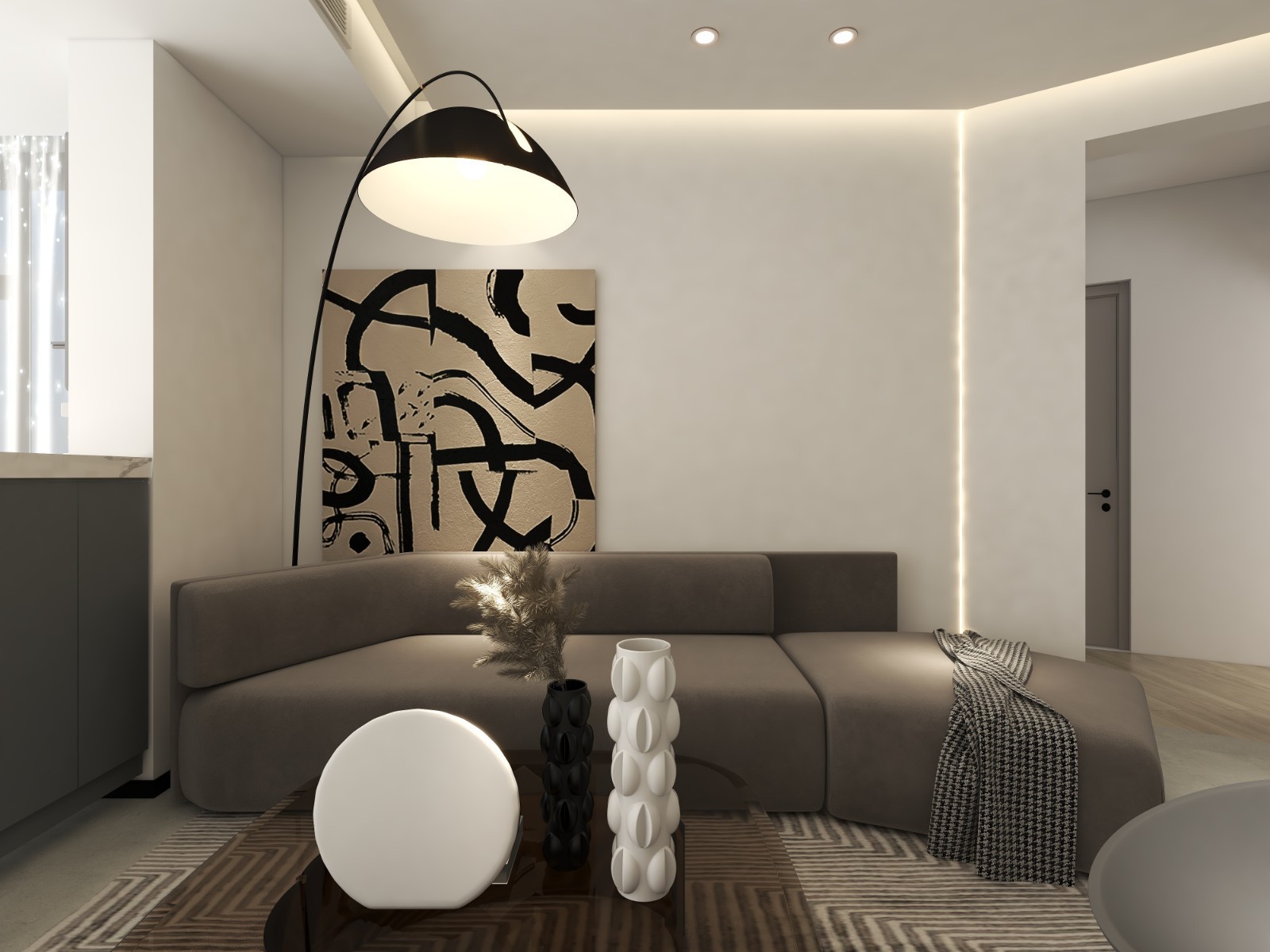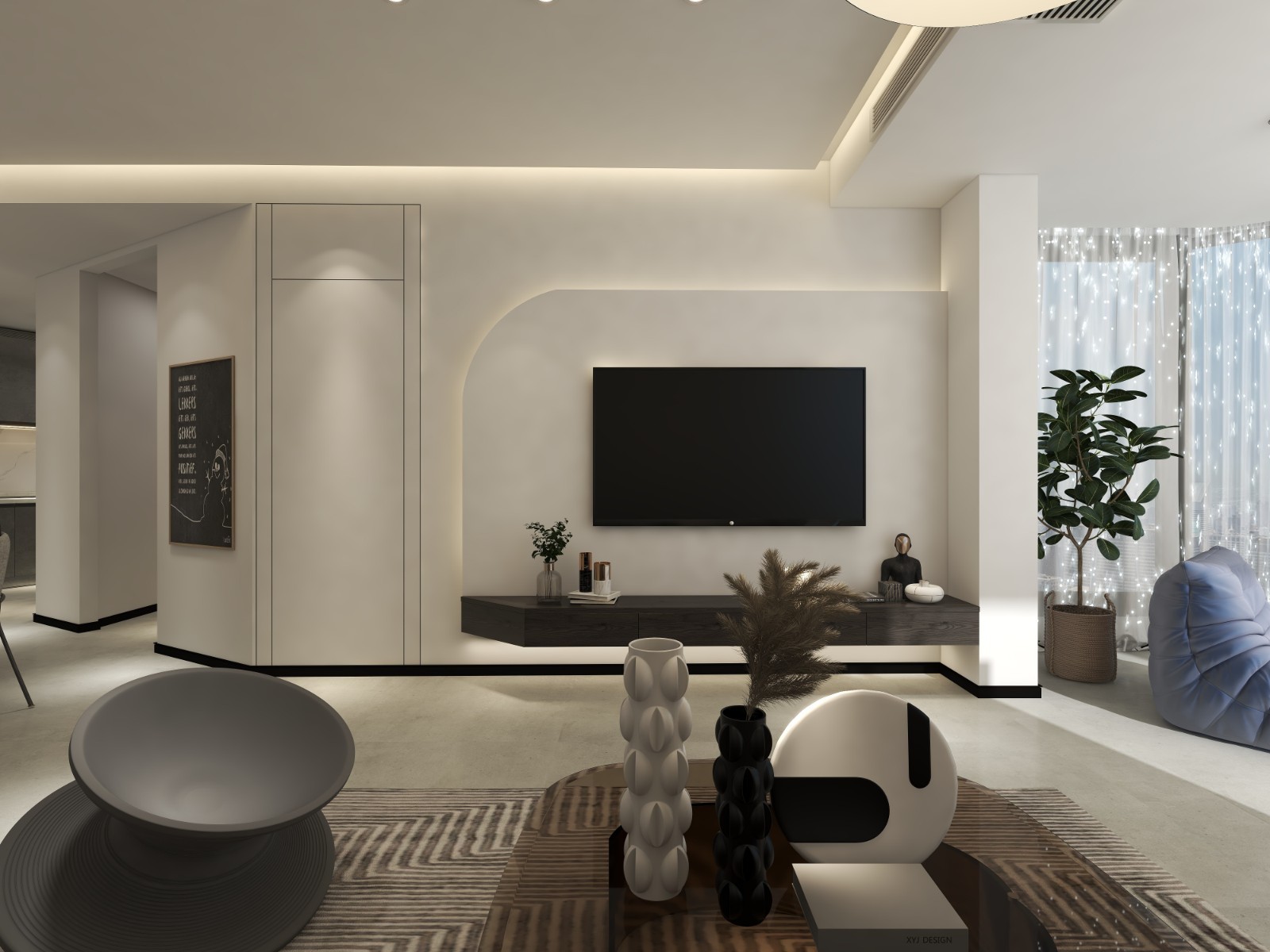电视背景墙以及沙发背景采用了线光源以及面光源,灯光的辅助,让空间更加舒适以及温馨。