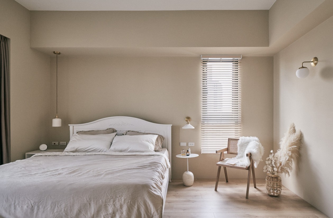 主卧整体都被粉刷成了非常温暖的奶茶色,配饰上也多以木料、灯具、毛绒装饰进行点缀,达到甜蜜且温馨的效果。