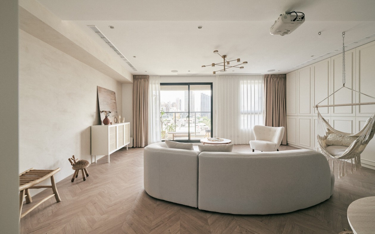 考虑到空间的使用,我们通常会将沙发摆放在边角处,但是在这个家里,为了更好的感受阳光、美景,设计师特意选择了弧形的沙发,并摆放在空间的中央位置,形成了一个有趣的舞台效果。