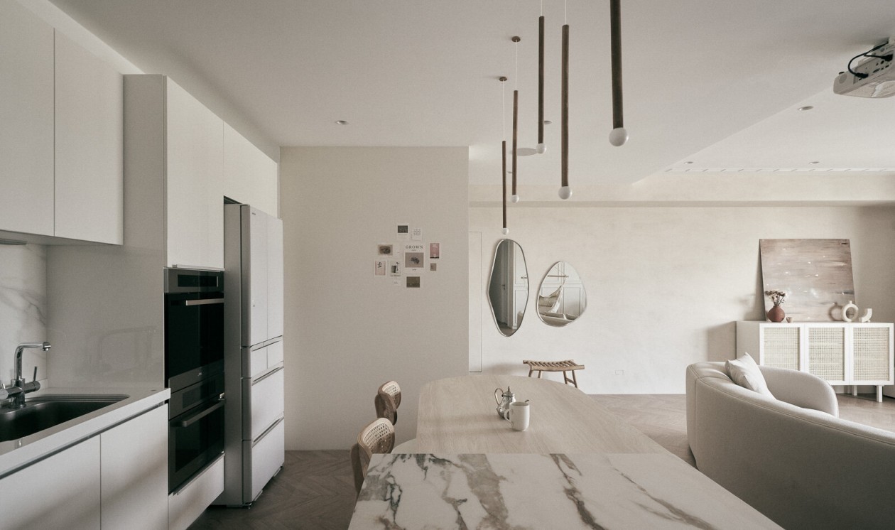 厨房区定制了一字型的料理台,浅色系与整体氛围相符,并围绕大理石吧台定制了实木餐桌,弧形的边角与餐椅,都显得柔和温馨。