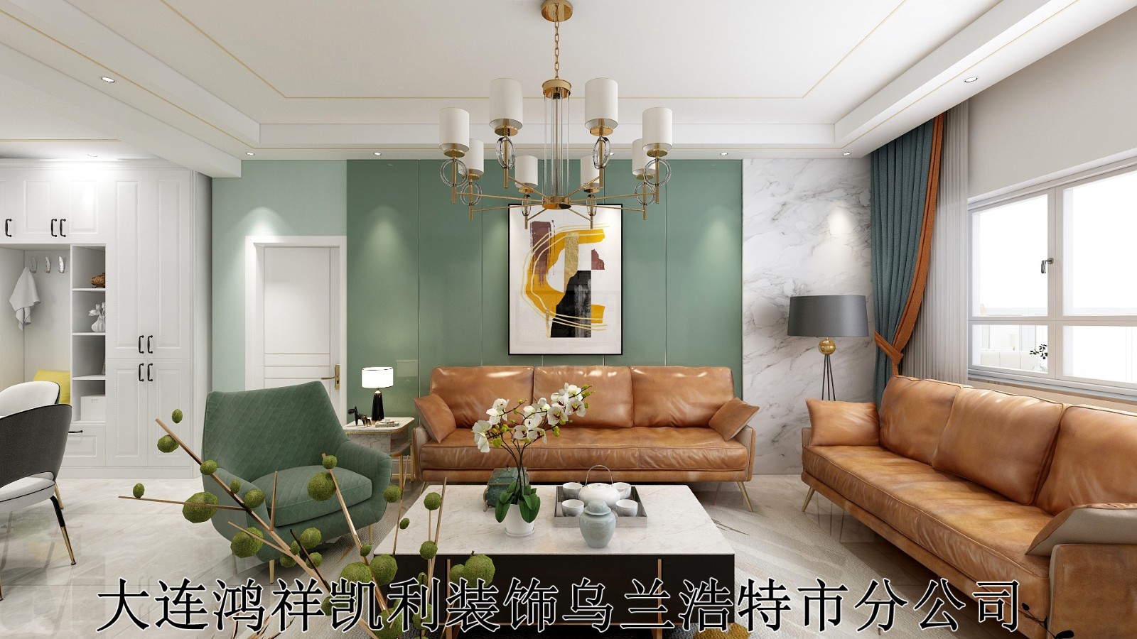 淡绿色护墙板和大理石碰撞搭配咖色皮质沙发尽显***感