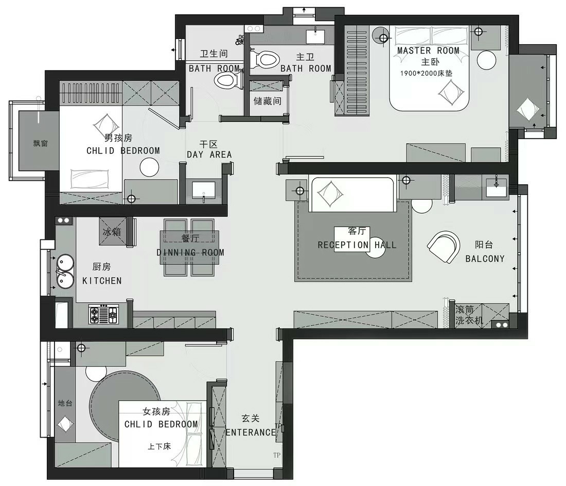 整个户型是一个长达11米,开间4米2的特长客餐厅空间,而且中间顶面无梁结构。层高3070是***亮点,也成了一个难点。
