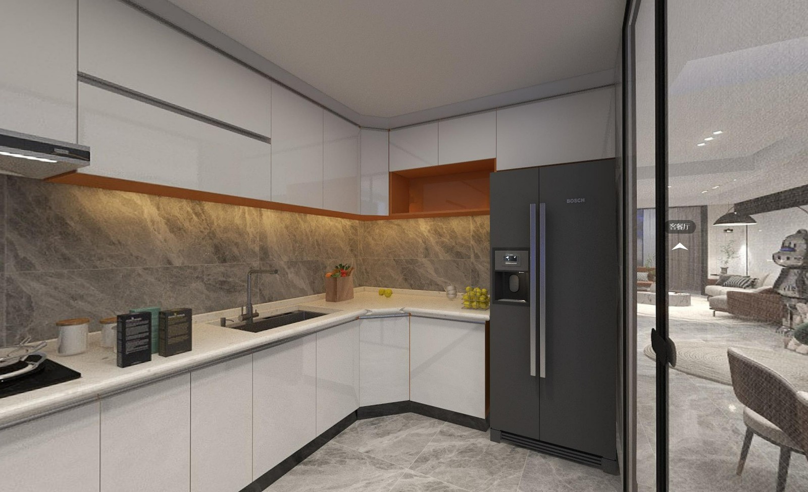 橱柜在装饰上使用橙色做了一些跳色,让空间更加灵动、活泼。