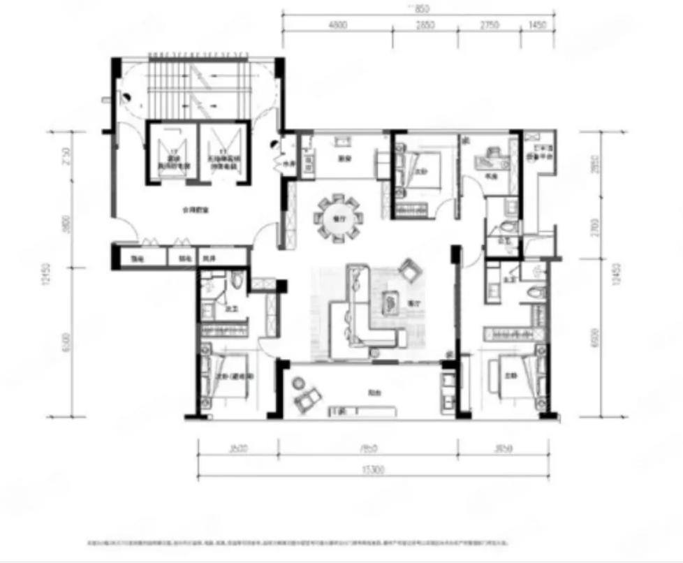 该户型空间布局规整,动静分区合理 。客厅、餐厅连通,空间开阔,采光通风佳,休闲、用餐互动性强。多间卧室分布有序,主卧带独立卫浴,保障私密性;部分卧室可灵活改造为书房等。设有多个卫生间,使用便利。还有专属设备空间,满足收纳与设备安置需求,整体适配家庭多元居住场景,兼具舒适性与实用性 。