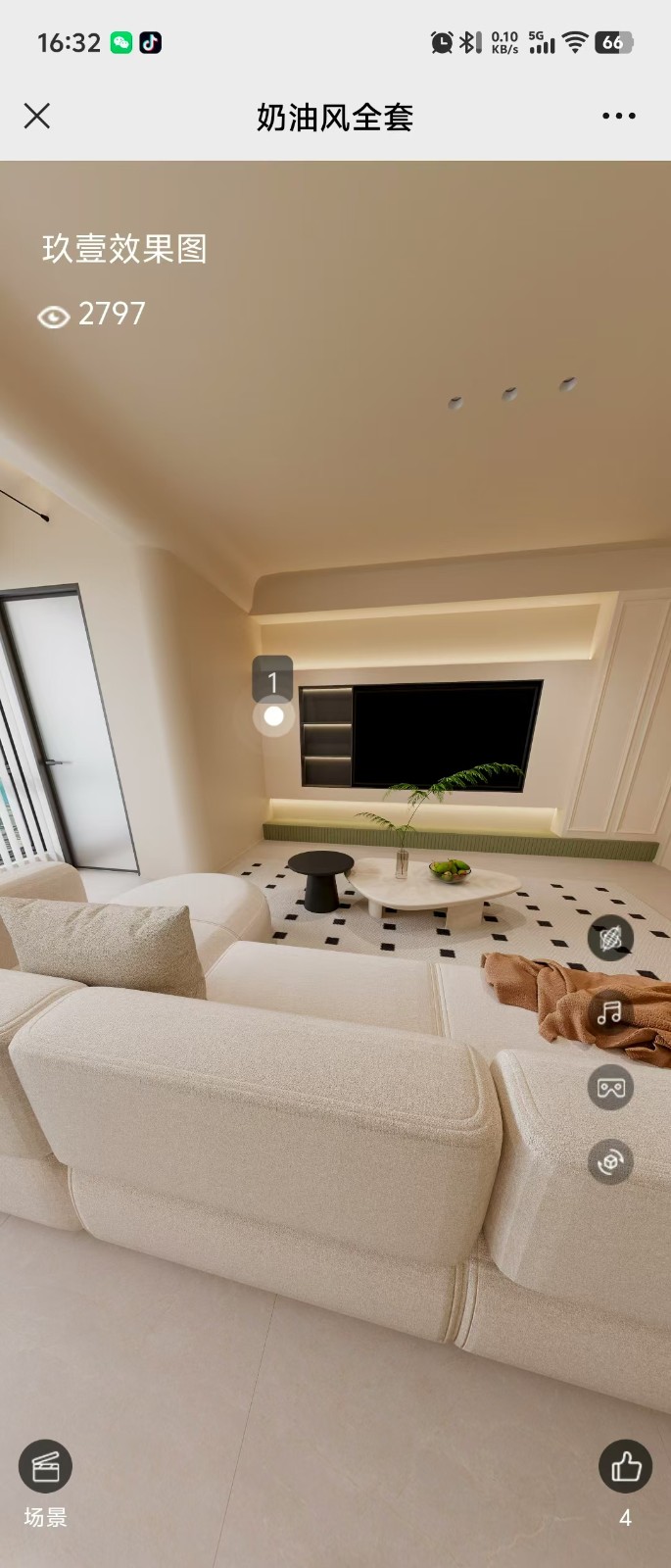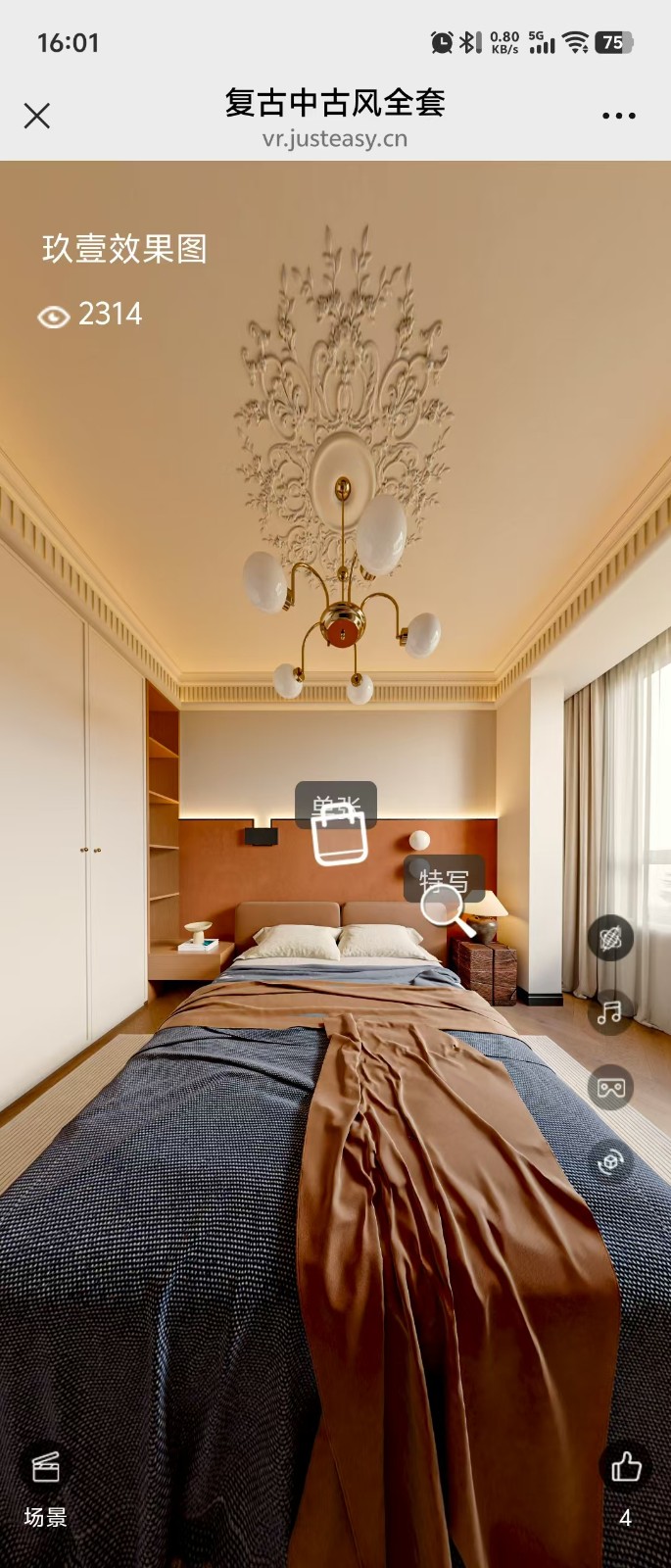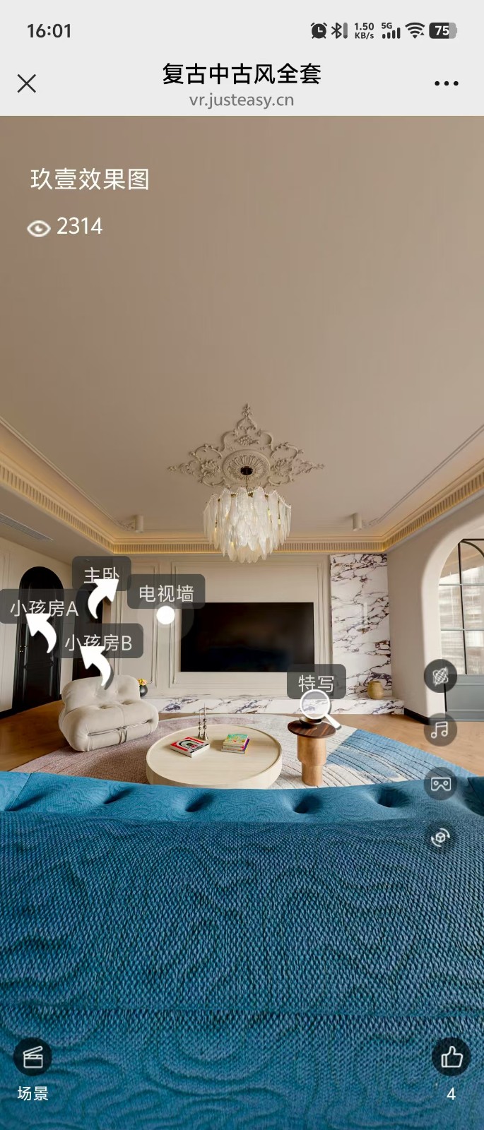 这是复古中古风格客厅,顶面有精致雕花与水晶吊灯,营造优雅氛围。墙面搭配大理石电视墙,简约大气。地面铺有拼接地毯,搭配圆形茶几、休闲单椅,软装舒适且具设计感。空间开阔,光线透过拱形窗引入,明亮温馨,既显复古韵味,又有现代生活的松弛感,是家庭休闲互动的核心区域 。