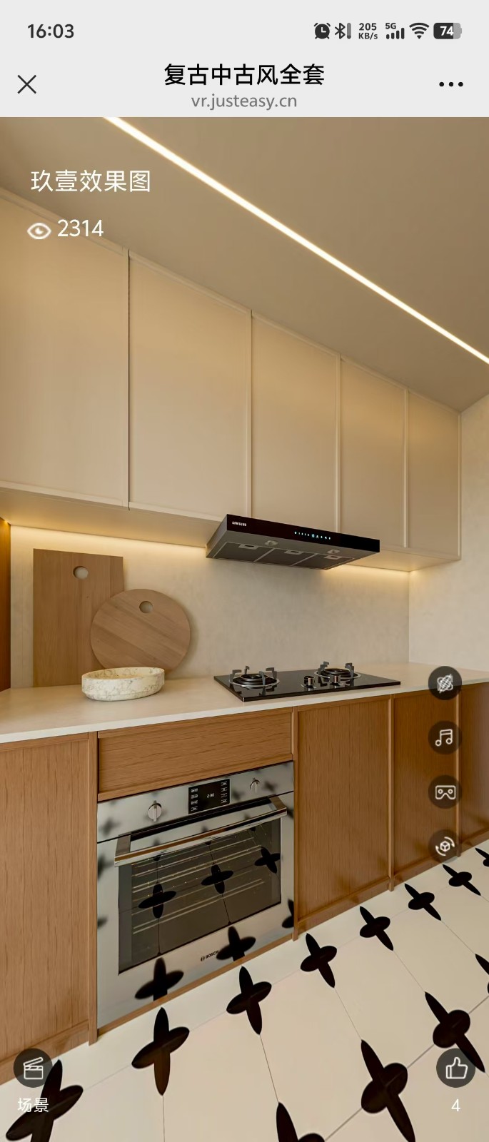这是复古中古风格厨房,整体色调柔和。浅米色吊柜简洁大方,搭配木质地柜,呈现自然质感。顶面线性灯与柜下灯带,营造温馨氛围。黑色烟机、灶台与银色烤箱,构建实用烹饪区。台面上原木砧板、石纹碗具,增添复古韵味。黑白十字花地砖,为空间注入中古特色,兼具美观与功能性,是惬意的烹饪场所 。